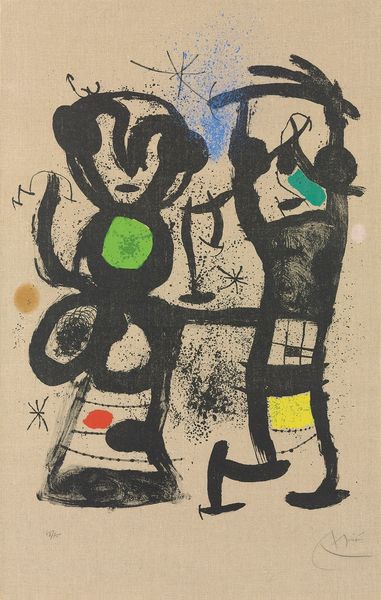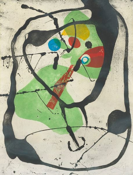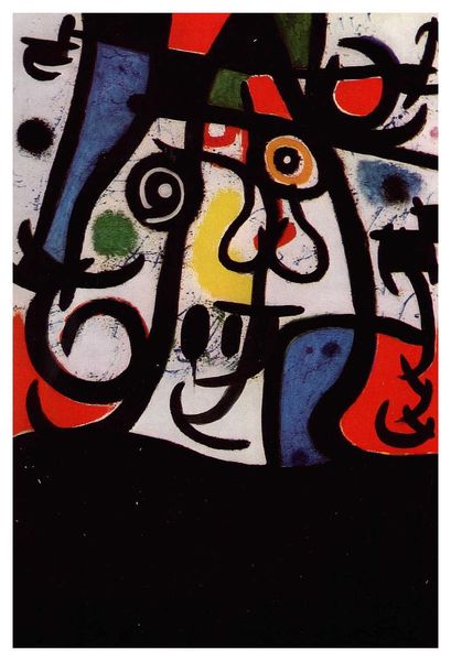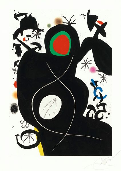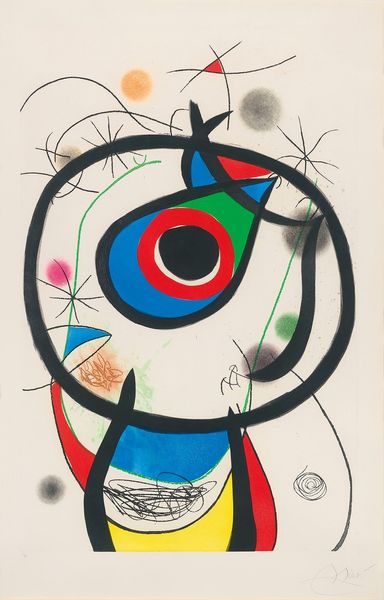 Joan Miró made this lithograph, 'For Pasadena', with ink and crayon, and what strikes me right away is how the process feels so present. You can see the layering, the splatters, the way the crayon resists the ink. There’s a real sense of play in how Miró handles the materials. The texture is flat, smooth but the colours give it such a sense of depth. The black lines feel both spontaneous and deliberate, like a dance between control and chance. Look at that big, black looping stroke right in the center. It's almost a signature gesture. It holds the whole composition together, but it also lets the other elements breathe. In some ways, it reminds me of the work of Kandinsky, another artist who was interested in the spiritual in art, especially how they use colour. It's like these artists are having a conversation across time, exploring the endless possibilities of form and colour. Ultimately, 'For Pasadena' reminds me that art is an ongoing process of discovery, where meaning emerges through experimentation and intuition.