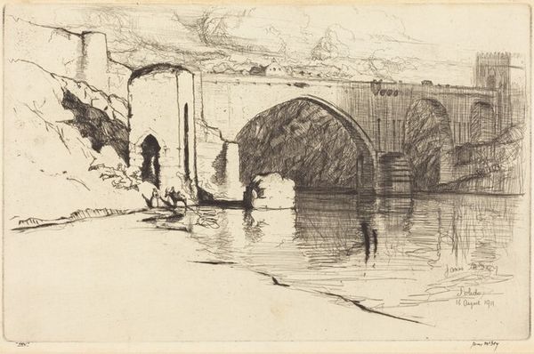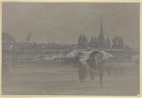 Curator: This is George Price Boyce's "Blackfriars Bridge: Moonlight Sketch," currently held in the Tate Collections. Editor: How evocative. The somber hues and muted light lend a rather melancholic air to the industrial architecture. Curator: Indeed, the composition is compelling. The bridge's arches create a series of repeating forms, almost like a visual echo, drawing the eye across the River Thames. Note the artist's use of watercolor to capture the subtle gradations of darkness. Editor: It speaks to the social realities of 19th-century London, when bridges like Blackfriars facilitated the movement of goods and people. Though the moon is not seen, its reflection dances like spirits on the surface of the river. Curator: A perceptive reading. The brushstrokes suggest a quiet contemplation on the part of the artist, a reflection on the urban landscape. Editor: Precisely. The sketch format and nocturnal setting transform a common scene into something intimate and, dare I say, rather romantic. Curator: I agree. A poignant interplay of form, light, and historical context. Editor: Quite. It leaves one to ponder the unseen stories unfolding beneath the moonlight.