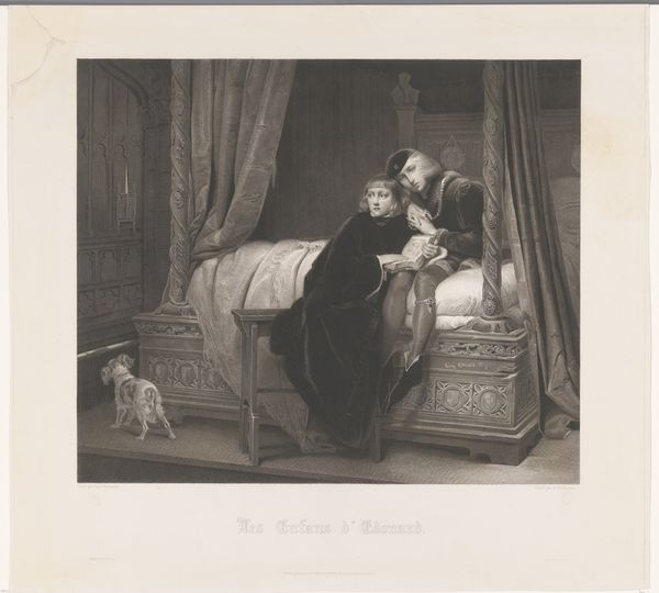 This image, "Mourning Woman, Sitting on a Bed," was made by Adolphe François Pannemaker, who lived in the 19th century. It's a print, likely an engraving or etching. This means Pannemaker would have painstakingly used a sharp tool to incise an image into a metal plate. That plate would then be inked and pressed onto paper, resulting in the image we see. The process itself is crucial to the picture’s impact. Think about the time and labor involved in creating all of those tiny lines, which add up to the overall scene. The material of the print, the paper, also contributes to its effect. The contrast of ink on its surface emphasizes the starkness of the woman's grief. This wasn't simply about artistic expression; printmaking was tied to the rise of mass media and consumption. These images were meant to be circulated, consumed, and perhaps sold. And so, in looking at this image, it's important to consider the social and economic context of its making, challenging traditional notions of art and craft.