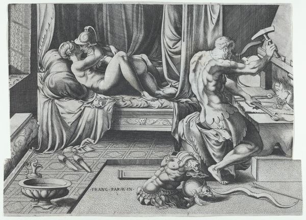 Editor: This is Pieter van den Berge's engraving, "David and Bathsheba," created sometime between 1692 and 1737. It's incredibly detailed for an engraving. There’s a tension between the classical setting and the intimate scene. What do you see in it, especially thinking about the time it was created? Curator: Well, first it's important to consider where something like this would be displayed and consumed. Engravings, especially depicting biblical scenes with erotic undertones like this, often circulated in private collections or portfolios. How do you think the political climate or social norms of the time may have affected how this print was received? Editor: Hmm, maybe it offered a permissible outlet for certain desires? Safe, because it was a history painting, but still... titillating? Curator: Precisely. Consider the role of patronage too. This wasn’t destined for a church. It was likely commissioned or bought by someone within the emerging bourgeois class eager to display wealth, knowledge of classical themes, and maybe a subtle critique of traditional power structures, all through the safely distanced lens of historical narrative. What impact does the presence of French text have on its interpretation and intended audience? Editor: I suppose it's designed for a refined, possibly international audience? I hadn’t thought about the way these smaller engravings circulated ideas so widely! Curator: Exactly. It tells us something about the cultural networks and aspirations of the owning classes, doesn't it? Even a "historical" piece reveals a great deal about its contemporary moment. Editor: I now understand it much better in terms of social commentary, because before I had never thought of the politics of its production and consumption!