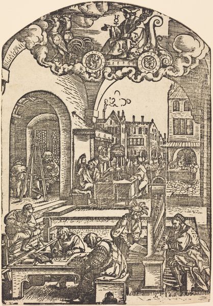 Curator: What a fascinating engraving. This is "Mercurius en zijn planeetkinderen," made in 1531, here at the Rijksmuseum. It’s attributed to an anonymous artist, and created with pen and ink. Editor: The first thing that strikes me is the detail. It's a small print, but so densely populated with figures and symbols. The overall feeling is one of focused industry, yet the floating figure above brings an element of otherworldly influence. Curator: Absolutely. Mercury, as a symbol, represented skill and ingenuity during the Renaissance, particularly within mercantile endeavors. Prints like these were intended to visually encapsulate complex astrological principles. Notice the figures in workshops—tailors, scribes, merchants; it reflects a very specific cultural preoccupation with craftsmanship as both a trade and an ideology. Editor: And how that idea of Mercury, god of messages, commerce and thieves, floats ethereally over it all! See the wheeling Zodiac figures—are those also representing crafts? And the inclusion of what looks like owls? They reinforce a kind of nocturnal pursuit of knowledge…or secrets? It adds another layer. It is like two worlds pressed into the same plane. Curator: Indeed! Remember that printmaking at the time was also booming commercially. It provided artists with autonomy outside traditional patronage systems, like church or court. So here, the engraving technique itself serves as the mechanical hand that makes possible widespread communication of astrological and social ideology to a broad audience. That act mirrors the very function Mercury represents. Editor: Very clever indeed. Though considering the meticulous, handcrafted approach required, perhaps this particular image also implies there remains a need for true artisans. Is this a snapshot of the era grappling with progress and what is lost in this process? Curator: Possibly. Images like this can tell us so much about Renaissance social structures and how visual messaging became democratized and served as both a recorder and facilitator of ideology. Editor: A confluence of so many narratives locked into a small print. I'll need another look.