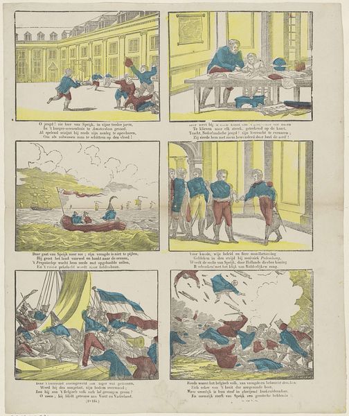 This sequential narrative by Pellerin & Cie. presents a series of comical misfortunes involving a raven, rendered in a lithographic print. The composition is structured into twelve distinct panels, each capturing a moment in the escalating chaos. The limited color palette, primarily of reds, blues, and yellows, creates a visually coherent yet simplistic aesthetic. Each panel acts as a signifier within a larger semiotic structure. The narrative progresses through a clear chain of cause and effect. The initial panels depict mundane domestic scenes which devolve into absurdity. The raven functions as a catalyst, disrupting the established order of the household and challenging the viewer's expectations of domestic tranquility. Through its actions, the raven destabilizes the fixed meanings of home and control, turning them into scenes of pandemonium. This speaks to a broader discourse on the inherent instability of systems and the potential for disruption within seemingly ordered environments. The artwork, through its sequential structure and thematic elements, invites us to reconsider the precarious nature of stability.
