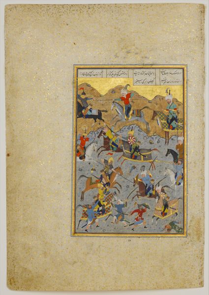 Curator: This painting, attributed to Abu'l Qasim Firdausi, is titled "Rustam Lassos Rakhsh" and comes from a Shahnama, or Book of Kings. Created sometime between 1425 and 1475, it provides a glimpse into a vibrant era of Persian miniature painting. Editor: My first impression? It’s wonderfully chaotic. All these horses in various poses, like a freeze-frame of some dramatic moment. There's a lot of earthy color in the figures contrasted by the lighter ground. I wonder about the story. Curator: The Shahnama is an epic poem central to Persian cultural identity, filled with legendary heroes and tales. Rustam, the central figure in this scene, is the most celebrated hero of Persian mythology. His horse, Rakhsh, is known for its incredible strength and loyalty. The piece, worked in watercolor and coloured pencil on paper, represents a key scene. Editor: And the figures! Their faces are so carefully rendered, especially considering the size of the work, right? The expressions hint at tension, like something is about to happen, some climactic event. The clothing too speaks to something historical… Curator: Exactly! Notice the attention to detail in the figures’ attire, the weaponry, and the horses' harnesses. These details offer valuable insights into the material culture of the time. We see these depictions mirrored throughout the illuminated manuscripts and objects made at court. Editor: Looking closer, I can also sense an almost spiritual element. There's a flattened perspective here which I tend to see as a technique that rejects a Western form of perspective that sought after realism. Instead, in Islamic art the depiction pushes away from the material plane in a similar way that Islamic geometric patterns symbolize transcendence, rejecting the literal or corporeal for something bigger and higher. It asks a lot from the viewer! Curator: I agree. These miniatures weren't just illustrations, but elaborate visual interpretations meant to evoke contemplation and reflection on the narratives they presented. The layering of the paint, choice of pigments and gold detailing also contribute to the quality and purpose of the piece which elevates the figures outside of the constraints of regular people. It emphasizes Rustam's status. Editor: So, by showing Rustam, a figure tied to nationalism and legend, in this stylized scene, this piece subtly reinforces identity and tradition? And does that relate to our experience now in the present day? Curator: Absolutely. The Shahnama, even in fragmented folios like this, remains a powerful symbol. Editor: Thinking about these complex layers - history, technique, social context - it gives me a richer understanding of this cultural moment, the story, and how they spoke, and still speak, to audiences. Curator: Indeed. "Rustam Lassos Rakhsh" is not merely a historical artifact, it’s a vibrant encapsulation of cultural values and artistic practices that continue to resonate.