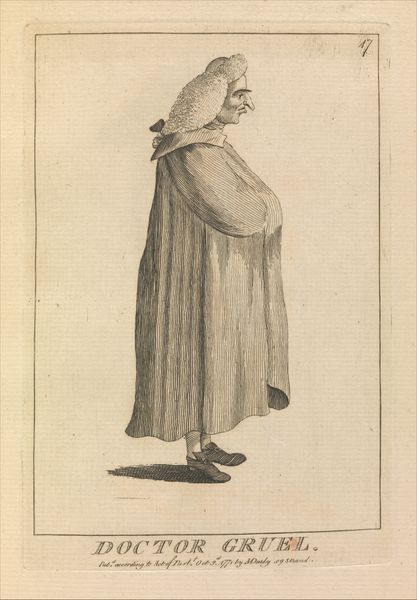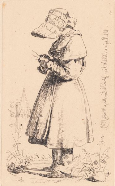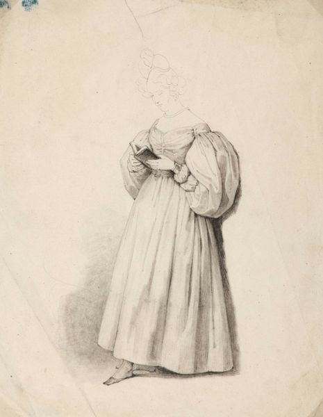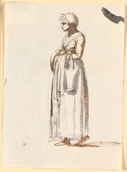 Curator: Let's pause here at Pieter van Loon's "Standing Woman with Basket on Her Head," dating back to 1840. Editor: Oh, she looks like she's stepped right out of a slightly smudged fairy tale! There’s something so candid and direct about her gaze. I wonder what’s in the basket? Laundry? Flowers? Perhaps her dreams? Curator: Fascinating. It's a genre scene, captured with pencil on toned paper, quite typical for the Romantic era. Van Loon likely sketched her in Düsseldorf, as the inscription suggests. Observe the tonal variations achieved through light pencil work. The formal lines emphasize structure. The geometric rendering of the skirt contrasting with the soft focus of the woman’s headscarf introduces a compelling juxtaposition. Editor: The Romantic era loved a good worker! You see her burden so simply yet dignified represented here. But also, this feels like a private glance into someone’s sketchbook, an idea in motion. What strikes me, formally, is how her weight shifts ever so slightly, the suggestion of movement...it teeters between study and something emotionally felt, doesn't it? It's an idea; is there any insight into her identity as opposed to an anonymous worker? Curator: While we lack definitive knowledge of her individual identity, we see through her clothes the reflection of class standing and profession as genre work. The artist chose to depict this subject from his present. We do not get that feeling as readily today in seeing work from this time. Consider it as part of a broader fascination in Romanticism to bring every person from different class backgrounds together as "one" society with their roles and lives. This piece acts as something of an artifact of daily living. Editor: So it goes beyond aesthetics, offering glimpses into societal structures. It really is so charming, with its modest means achieving the monumentality of its model! Thanks so much for sharing that context with me; it definitely has given me something else to consider. Curator: Of course. It's a dance between observing the form and reading into its cultural echoes. A simple sketch but a potent reminder of art’s role as a historical and visual record.