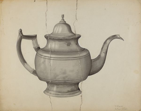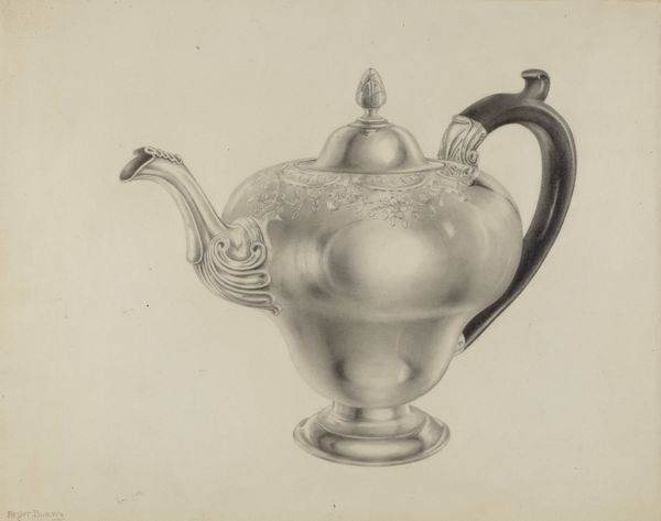 Curator: Here we have J.J. O'Neill's "Teapot," a pencil drawing estimated to be from around 1938. Editor: Well, immediately I'm struck by its almost photographic realism. The detail on the metallic sheen and decorative band is remarkable for a pencil drawing. Curator: Indeed. The artist clearly spent time considering the play of light on the object. The question I have is, what does it tell us about the social landscape of art production at the time? Was this piece intended as a preparatory study, or perhaps a comment on domesticity? Editor: I wonder, could the artist have been involved in manufacturing, even as a skilled worker, given their mastery of capturing this everyday object so realistically? Were they perhaps examining the shift towards mass-produced metal goods? Curator: Interesting! Perhaps. Or, consider that drawing was often taught in art schools as foundational to other media. Is this an academic exercise exploring form and value? We should look into where O'Neill was working at the time to fully grasp the context. Editor: Right, and even if it's 'just' an academic exercise, the choice of subject is interesting. Tea was still quite central to social rituals for many, and here it's rendered meticulously with a tool—the pencil—readily available. What were the limitations and resources influencing these types of art during the era? Curator: Exactly. This pushes us to reconsider assumed hierarchies between fine art and, say, design, as both existed side by side at that time. How were skills and labor valued or devalued across different artistic practices? Editor: I agree. Seeing this teacup elevated—depicted in such fine detail with accessible materials— prompts us to question value and taste during this particular time in history. What narratives do these objects carry? Curator: Thinking about all this, what seems simple initially turns out to hold so much more. I find myself appreciating the complex connection between domestic life, mass production, and skill so masterfully. Editor: Yes. And now, when I think of the object this drawing represents, the humble teapot itself takes on added significance and offers new insights into material and social practices.