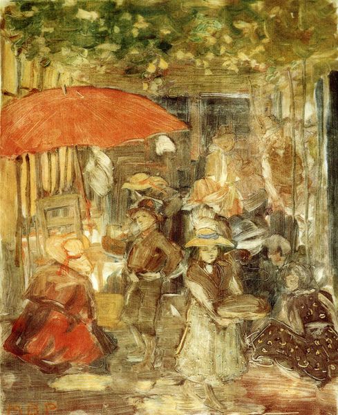 Editor: Glackens's 1906 painting, "Café de la Paix," renders a Parisian café scene with oil on canvas. There’s a sort of intimate, shadowy quality to it despite the bustling subject matter. What stands out to you in its composition? Curator: I note first the layering of planes, establishing depth and guiding the eye. Observe how the artist organizes the foreground figures with considerable clarity in contrast to the obfuscated background with muted colors of black and brown that hint at distant figures in horse carriages. What impression does this create? Editor: It almost feels as if we're intruding on a private moment, separate from the outside bustle. Are there other details in the composition that enhance this? Curator: Indeed. The thick impasto application catches the light and brings life to these anonymous figures. Look closely at the interplay of warm and cool tones. What does the dynamic between light and shadow suggest about Glackens’ intentions? Editor: Maybe he aimed to capture a sense of momentary feeling rather than objective reality? Like a snapshot of a feeling. Curator: Precisely. He exploits formal means, eschewing pure representation for emotive evocation. The formal dynamics result in a heightened subjective impression on the viewer. Notice also how the gaze of all subjects is turned away or lowered in contrast to other Impressionist café scenes, enhancing a mood of melancholic contemplation. Editor: This focus on individual perception definitely shapes the piece's unique voice within Impressionism. I hadn’t quite noticed that subtle use of directionality before. Thanks! Curator: My pleasure. Examining these intrinsic formal features often yields unforeseen levels of insight into a painting.