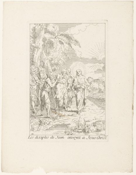 Gabriel Huquier created this print, "Plukken van koren op de sabbat," likely in the early 18th century, a period marked by strict social and religious norms. The artwork depicts a biblical scene where Jesus's disciples are criticized for harvesting grain on the Sabbath. During Huquier's time, debates about religious law and its interpretation were intense. This print subtly engages with such issues, inviting viewers to question rigid adherence to rules versus the compassion and human needs. Note how the expressions of the figures convey a sense of tension. The halo around Jesus separates him from the rest. Huquier uses this biblical story to reflect on contemporary social issues. By revisiting this ancient debate, he prompts us to consider what it means to balance tradition with humanity.