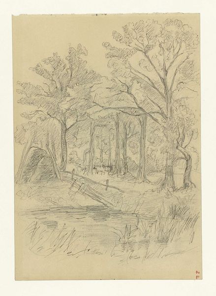 Curator: Immediately I see tenderness. This pen sketch by Jozef Israëls, possibly from his personal sketchbook, features a thatched house near a lane with a solitary figure, dating from around 1834 to 1911, currently at the Rijksmuseum. There's something heart-wrenching about it. Editor: That figure does seem to bear the weight of something, doesn't it? They are bent slightly with what I take to be is their burden. It's as though the drawing itself understands a deeper melancholic atmosphere, a symbolism rooted in solitude and toil. The very basic form that he has used suggests this figure is caught up in the banalities of simply getting through the day, unacknowledged and probably, from what it appears they have over their back, working on a land far away from civilisation. Curator: Exactly! It evokes a sense of gentle quietude in the scene but also hints at themes of struggle and simple rural life. The sketchy lines of the house suggest a sense of place and temporal existence. Like the roof of the house – they look a bit run down but still exist. Editor: I agree. The house almost mimics the figure; hunched and weary against the elements. Notice how Israëls doesn’t idealize the landscape. This isn't some grand estate but instead a commonplace existence rendered with quiet dignity. He has chosen not to romanticise it or offer a sense of escape. Even the material itself – humble pencil and pen on paper – emphasizes this feeling. The tree beside the figure perhaps suggesting safety or perhaps even mirroring them. Curator: Yes, the figure blends subtly into the environment. I see here the cultural impact; a sense of the weight of labour, or what the French term 'douleur' , sorrow. The trees are like silent witnesses and almost become part of her. Editor: There’s a connection with that building that stands out to me. One often reflects or relies upon the other for protection or well-being. It is their history combined. But it does draw to an idea that is left behind and perhaps should be reflected on. It tells a silent story. Curator: Yes. So powerful from a simple pen and pencil sketch. Something about the stark lines draws the observer closer. It creates a sense of humanity. Editor: A beautiful depiction, where the humble medium amplifies the silent stories embedded within.