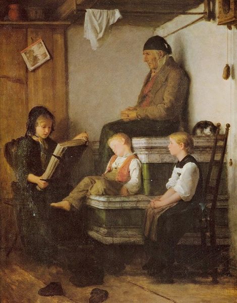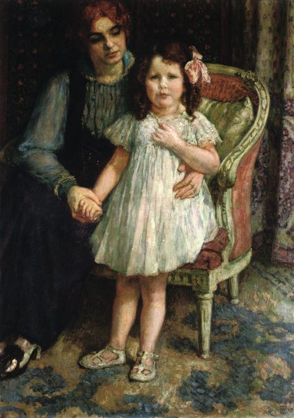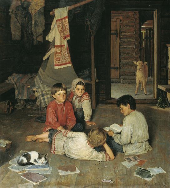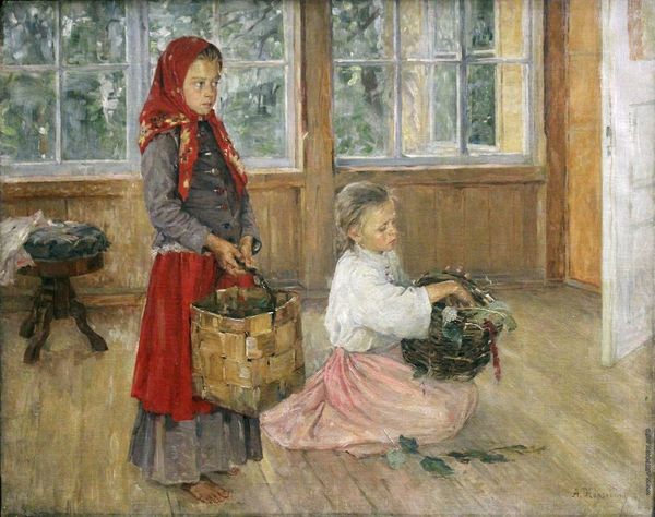 Nikolay Bogdanov-Belsky's painting "Country Friends" is this wonderful, quiet moment, likely made with oils, of three girls relaxing together, one playing a mandolin. There is a freedom in the brushwork, a looseness, that gives it a relaxed feel, very different from the polished surfaces you find in some academic painting. You can almost feel him making marks. I like the way he handles the textures here, the way the light catches the different materials and patterns. Look at the girl in the red dress. It's like a sea of red, broken up by these small, pale ovals. They don't really describe the fabric, but they give a sense of its liveliness. It's less about exact representation and more about capturing the overall feel, the process of seeing. That feels very contemporary to me. I'm reminded of the way Vuillard would combine figures and patterns to flatten the space of a painting. Bogdanov-Belsky isn’t afraid to let things be unresolved, to embrace the ambiguity of the painted surface.