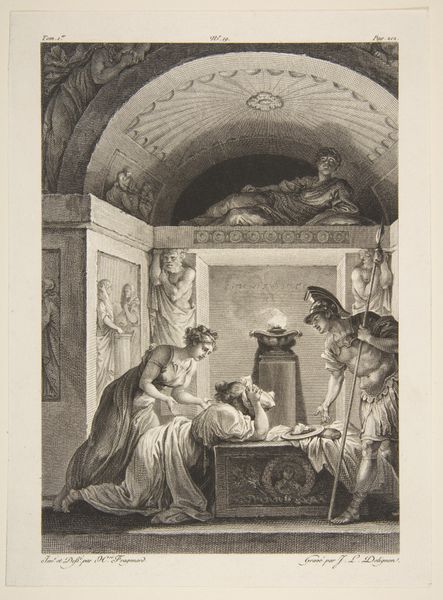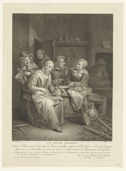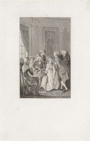 Editor: So, this is "Mannen en vrouwen rond een tafel met kaarsen," or "Men and women around a table with candles," made in 1770 by Daniel Nikolaus Chodowiecki. It's an etching. It’s quite dark, both literally and figuratively. Everyone seems huddled around those candles. What do you make of it? Curator: I see a snapshot of societal dynamics, subtly illuminated. The candlelight, of course, immediately evokes ideas of secrecy and intimacy. Consider how light, and darkness, act as powerful symbols in art and in the human psyche. It creates an environment that invites contemplation. Editor: Intimacy and secrecy, yes! It feels almost like they are conspiring. Is there something about the era that contributes to that feeling? Curator: The Baroque era reveled in such visual storytelling, didn't it? Note how the gathering around a table bathed in candlelight transcends a simple social event. It hints at unspoken exchanges, social hierarchy, perhaps even shared secrets. What emotional or cultural resonance do you find in such scenes depicted across centuries? Editor: It's interesting how the seemingly mundane is filled with such hidden depths! I see now the appeal of iconography - images truly speak across time. Curator: Exactly. Each element carries symbolic weight accumulated over time. The act of gathering itself becomes a ritual, imbued with cultural meaning. So, what's your final impression of what the artist is communicating with us here? Editor: I think the artist uses this setting to capture something very human – the subtle play of power, trust, and maybe even a little bit of deceit within social circles. It's fascinating how much narrative can be packed into a seemingly simple scene.