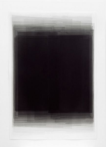 Curator: What a striking contrast. Before us is Brice Marden's "Adriatics (A)," a piece dating back to 1973. Editor: My immediate reaction is a sense of stillness. The monochrome palette coupled with those stark geometric forms projects a feeling of profound quietude. How interesting… Curator: It's incredible how Marden manages to evoke so much with so little. The duality of the black and off-white, the precise lines, creates a very balanced composition. Do you perceive any symbolism behind the contrast? Editor: The diagonal lines, they give the sensation of the sea when seen from above—might that tie it back to its title "Adriatics"? Maybe representing currents? Then you have the solid black space, which I feel roots the piece. What a curious relationship… I would wager Marden sought to juxtapose the transient with the grounded here. Curator: An astute observation indeed. Geometric abstraction has historically been read as emblematic of utopian aspirations. Is this reading applicable here, despite the work's austere, subdued nature? Editor: Not in a straightforward way. It doesn’t offer an obvious vision for an improved social framework. Perhaps, if you perceive this dialectic to be about harmonizing contrasting elements… But its message feels intentionally ambiguous and contemplative. The bare lines and fields of tone serve, in my opinion, as a mirror to reflect on one's own sensibility. Curator: You know, while the monochrome scheme seems minimalist, it carries a substantial weight of cultural precedents, linking up with various histories of ascetic imagery… How would you interpret this echo through art history? Editor: By denying any grand narrative or symbolism, the artist directs our gaze back to the essentials of art – the form, color, texture, and line itself. With it we see not necessarily a link to tradition but an interrogation of art as a visual phenomenon, its fundamental essence. It invites us to witness, process, and simply *feel*. Curator: Your interpretation casts a light on its complex subtleties. The beauty in reduction and quietness! I hadn’t perceived it in that sense before. Editor: Exactly! And for my part, I hadn't quite noticed those echoes with art history, the ascetic lineage of black and white. That’s wonderful!