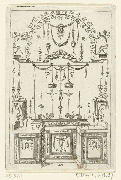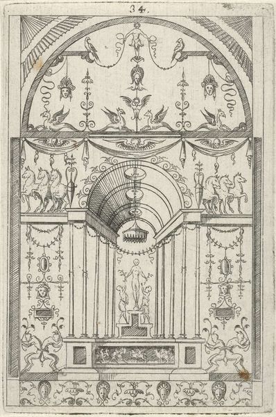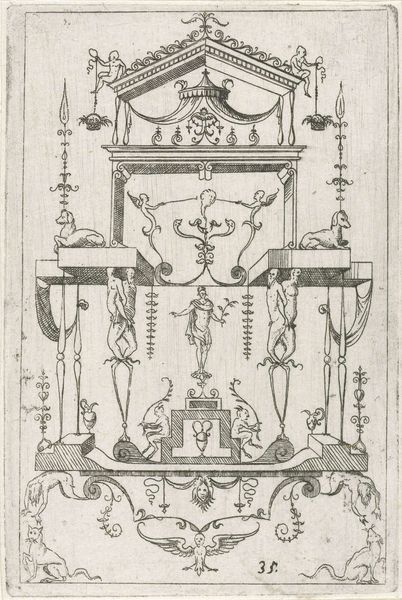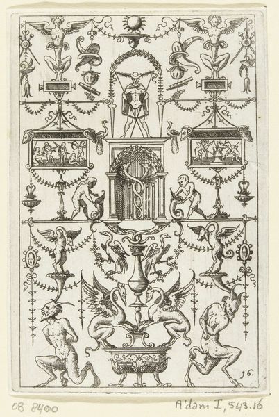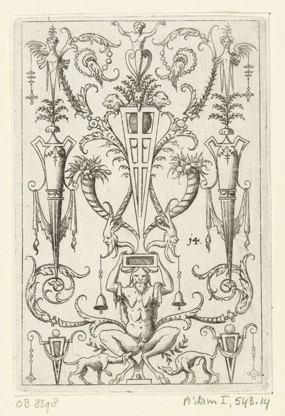 Hans Sibmacher created this ornamental design featuring satyrs and mascarons, sometime before 1611. During the late Renaissance, ornament prints like this one were not just decorative, they were vital tools for artisans. Here, Sibmacher presents a frieze populated with classical figures. Satyrs, those hybrid creatures of man and beast, were often associated with revelry. But let’s consider how these images might function within the cultural landscape of the time. The satyrs, frozen in their poses, hint at the complexities of identity and representation. The design invites us to reflect on the era’s fascination with classical forms and the ways in which the body was presented and controlled. Ultimately, Sibmacher's drawing offers more than mere decoration. It presents a fascinating dialogue between the classical past and the artistic practices of the Renaissance, prompting us to consider the cultural values embedded in ornamental design.