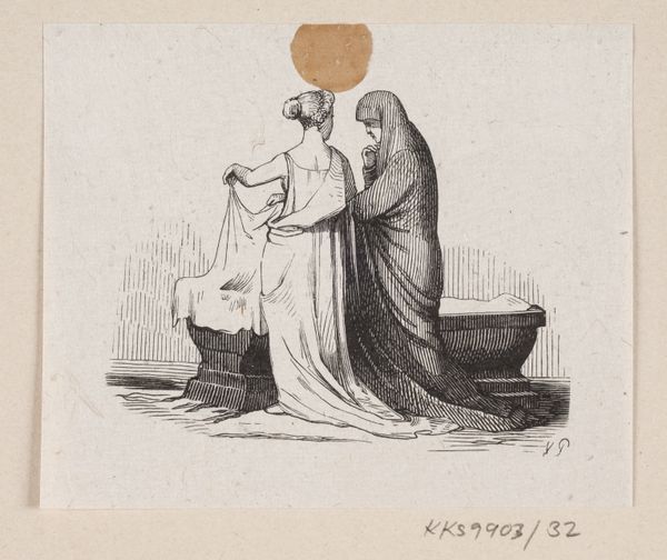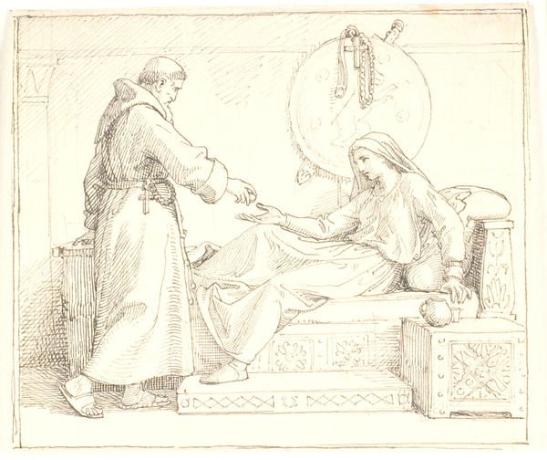 This small illustration of "Svend Tveskægs tog til England og slaget ved Svold" captures a moment steeped in the complex interplay of power, gender, and faith, from an anonymous hand. Consider how the reclining woman contrasts with the standing monk. Is she a queen, ill or in distress, receiving counsel or perhaps absolution? The rosary hanging on the wall suggests a spiritual element, yet the sword hints at the worldly power at play. The artist’s choice to depict this intimate, perhaps vulnerable, moment invites us to consider the roles women played—or were perceived to play—in shaping historical events. In a period where narratives were often dictated by male perspectives, this illustration offers a glimpse into the emotional and personal dimensions of leadership and influence, challenging us to reflect on whose stories are told and how.