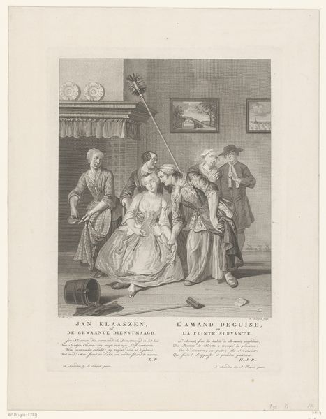 Carel Christiaan Antony Last made this print, Scène uit Jan Claasz of de gewaande dienstmaagd: De ontdekking van Jan Claasz, in the Netherlands sometime in the 1800s. It depicts a scene from a play, likely a popular comedy of the time, playing with themes of deception and mistaken identity. But looking beyond the immediate narrative, we might consider the social theater that's being staged. The central figure, dressed in women’s clothing, is surrounded by onlookers. Their expressions and gestures suggest a mix of shock, amusement, and judgment. Notice the detailed rendering of the interior, complete with period furnishings and costumes. These visual elements offer insights into the domestic life and social customs of the Dutch middle class. How did these people view themselves and others? To fully appreciate this print, we could delve into the history of Dutch theater, exploring the kinds of plays that were popular and the social values they reflected. We might also investigate the artist’s biography, looking for clues about his own social and political views. By situating art within its historical context, we can gain a richer understanding of its meaning and significance.