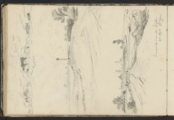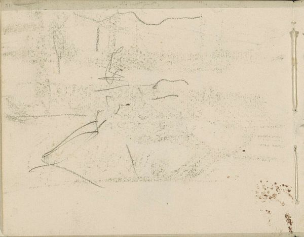 Curator: Let's turn our attention to this landscape drawing by Willem Cornelis Rip, titled "Man op een landweg met bomen", or "Man on a country road with trees," from 1895. It’s a delicate sketch executed in pencil on paper. Editor: Immediately I’m drawn to the textural quality – the roughness of the paper almost feels like it's part of the scene, amplifying this desolate atmosphere in the work. It's like feeling the gritty dust of a country path. Curator: Indeed. Rip was active during a period where Impressionism was shifting how artists engaged with landscapes. Note how he uses short, broken lines to suggest movement and light filtering through the trees. It’s not a photorealistic depiction, but more about capturing the sensory experience of being there. Editor: For me it speaks to a different mode of production. You can see the immediacy in the artist's hand; the sketch appears quite spontaneous and unpremeditated. There is nothing laborious in the crafting, more so about getting the impression immediately in that particular point in time, almost journalistic, capturing that instant sensation, what the path offers to the observer. Curator: Precisely, sketching outdoors, en plein air, allowed artists to record fleeting moments and atmospheric conditions directly. It democratized the making process allowing many people to make landscape sketches of the scenes that were presented before their eyes. How accessible was paper during those times? Were there specific drawing supply workshops during that time that allowed artists of varied social status to get drawing materials? These are interesting sociological perspectives, not only artistic. Editor: Those are relevant questions. Rip's sketch, though seemingly simple, is layered with considerations of the artist's process. It is quite apparent that a whole range of material possibilities arise to interpret this artwork from this point on. Curator: Considering the time and its cultural context helps us recognize this as an artwork reflecting its specific moment, and the artistic shift happening then, with all the challenges of a period in turmoil. Editor: And thinking about materials, production, and social accessibility enriches our experience as a tangible connection to a lived past, providing more questions to be analyzed about this beautiful pencil work. Curator: A fascinating confluence of history, artistic skill and socioeconomic perspectives embedded in what seems a simple sketch. Editor: Exactly. It’s these very elements that transforms the drawing in something of interest, as a product of both labor and a particular historical situation.