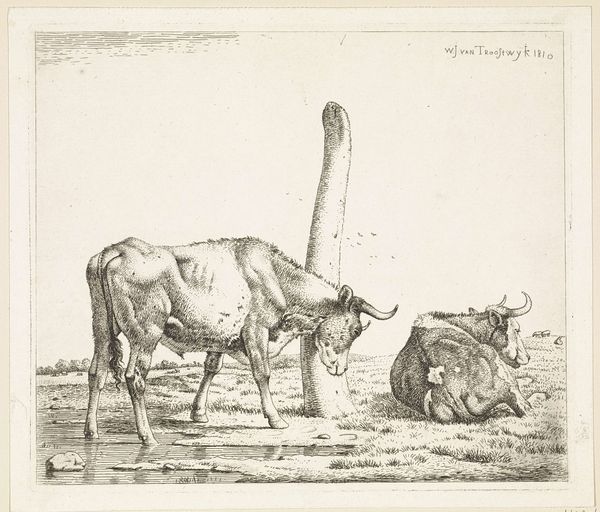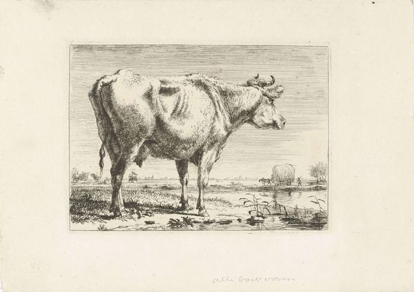 Editor: This engraving, “Mager Schaap,” or "Meager Sheep," created sometime between 1815 and 1860 by Abraham Hendrik Winter, depicts a rather scrawny sheep in a landscape. I’m struck by how vulnerable and exposed the animal seems, despite the bell around its neck and the presence of what appears to be a town in the background. What stands out to you? Curator: What immediately draws my attention is the juxtaposition of symbols here. You have the sheep itself – a longstanding symbol of innocence, purity, even sacrifice. Yet this particular sheep is "meager," worn, almost burdened. Consider, too, the bell; it signals belonging, yet perhaps also restriction, controlling movement. What feeling does this evoke in you? Editor: I feel a sense of… pity, almost? Like the sheep is a symbol, as you said, but also an individual struggling within a system. The landscape, even with the church, feels a little bleak. Curator: Precisely. Think of the enduring symbolic weight of sheep in religious iconography, contrasting sharply with its emaciated condition. Winter perhaps prompts us to consider societal implications. Notice how Winter positions it in relation to the church steeple, evoking visual rhymes of shape and shared height. What might the church symbolise, and how might the sheep’s condition comment on it? Editor: Maybe the artist is pointing out the church's failure to care for its flock, represented by the sheep? Or the vulnerability of faith? Curator: It's possible, or perhaps about the burden that institutions may put upon people. What lingers for you as we consider the implications? Editor: I hadn’t really considered how loaded a simple image of a sheep could be! I definitely see this print differently now. Curator: And the act of re-seeing familiar forms, infused with critical re-evaluation, embodies the symbolic power this etching contains.