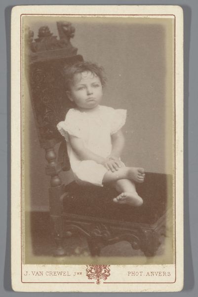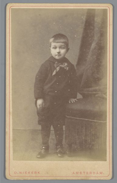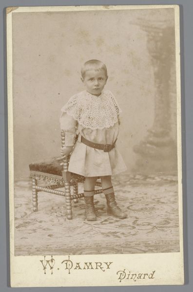 Curator: The gaze of this young girl is rather striking. It’s almost unsettling in its directness. Editor: Indeed. And what we're looking at is a gelatin-silver print entitled "Portret van een onbekend meisje," or "Portrait of an Unknown Girl," attributed to E. Chesnay, dating from around 1890 to 1910. The printing process really draws the eye, the tones adding so much weight to the overall affect. Curator: The sitter is a girl in a simple dress, knee high boots and what appears to be velvet trims to the cuffs and collar; her direct gaze clashes with the performative setting with ornate backdrop and her stiff pose; the construction reveals the studio, rather than trying to disguise it. Editor: It speaks volumes, doesn't it, about the studio portraiture practices of the era? Photography democratized portraiture, moving it away from the wealthy who commissioned painted portraits and opened this avenue up to the expanding middle class, documenting their families through new means. Curator: The visible texture of the print itself enhances that sentiment too; you can almost trace the image-making through touch and material; it bridges the divide between mass production, but through careful labour. What do you read from it? Editor: I'm immediately drawn to her expression. Children in this period were so carefully molded in social performance, the fact this image offers this glimpse of directness – the lack of the performative smiles, is rather powerful. Curator: Right. These were transitional times regarding understandings of children within social spaces. Perhaps it shows a burgeoning sense of individuality starting to disrupt previous traditions? Editor: Maybe it’s my awareness of what happened subsequently in the twentieth century, but viewing it now, it becomes such a haunting relic of history. Curator: Yes. We understand this portrait in a totally new way due to later social understanding. This medium provides a rare glimpse, it truly reveals so much regarding cultural contexts that are so far removed from our current day. Editor: Seeing the hand of the maker evident, within such a context adds many more complex readings to such a seemingly simple object, it is hauntingly revealing.