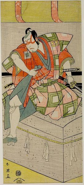 Curator: Katsukawa Shun'ei's woodblock print, simply titled "Actor," presents us with a figure steeped in the visual culture of late 18th-century Japan. Editor: Whoa, that robe! It's like a wearable maze. I wonder if he ever got lost in it himself. Curator: The geometric pattern is striking, isn't it? But beyond the aesthetic, it speaks to the social context of kabuki theatre during the Edo period and its role in reflecting and sometimes subverting societal norms. Editor: It feels incredibly modern, almost punk. Look at his face, too, that defiant stare. He's not someone you'd want to cross. I am also feeling a sense of protection. Curator: Precisely. Shun'ei masterfully captures the actor's persona, highlighting the complexities of gender, class, and performance in a rigidly structured society. The print, now residing at Harvard Art Museums, becomes a lens through which we can examine the intertwined relationship between art and social identity. Editor: I think I see the method acting. This makes me think that what we wear really is the projection of ourselves. Curator: Indeed, and it's through these kinds of investigations we enrich our understanding.