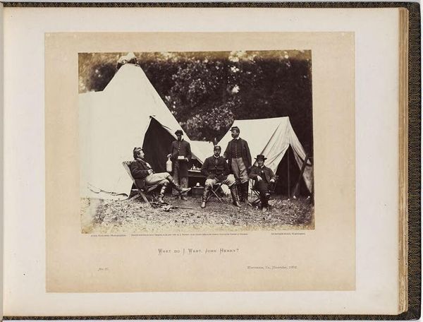 Curator: Alexander Gardner's "Group at Secret Service Department, Headquarters, Army of the Potomac, Antietam, October 1862," a gelatin-silver print taken during a profoundly turbulent moment in American history. Editor: My initial reaction is a sense of studied stoicism. The sepia tones evoke a heavy weight, and the arrangement, the way these men present themselves…it's all carefully considered, staged for posterity, I'd say. Curator: I'm drawn to the material conditions that produced this image. Consider the laborious wet plate collodion process Gardner employed, lugging his darkroom tent across the Antietam battlefield. Each print was the result of immense physical effort and chemical mastery. Editor: Absolutely, and you can discern some of the constraints of that process within the composition itself. The stillness of the figures suggests the longer exposure times. But beyond the practical, the composition organizes a complex web of power relationships. See how General Allan Pinkerton is centered? Curator: True, Pinkerton's position reinforces the hierarchical structure of the military, as do the sartorial choices and objects they wield: look at the swords. Yet, I'm struck by the image's function as wartime propaganda. These photographs were consumed by a public eager for news and reassurance. How does that knowledge shift your view? Editor: It deepens my reading, actually. The formality contradicts the immediacy we expect from photojournalism, doesn't it? Instead, it feels like they're consciously constructing a narrative of control, of a well-oiled machine in the face of utter chaos. It's interesting how the uniforms serve as visual signifiers too. Curator: Right. Uniforms weren't just protection; they signified allegiance, manufacturing consensus. So this photograph not only documents, but also performs, a specific version of the war for civilian consumption. We must think critically about the layers of mediation between experience and image. Editor: The act of creating such an image – carefully composing this "incident of the war" for broader distribution – is clearly as powerful as any action these men took on the battlefield. I appreciate this piece as a way to look deeply into constructed images. Curator: And for me, reflecting on Gardner's access to resources, his equipment, his audience…it exposes photography as an industrial process deeply entwined with social and political power.