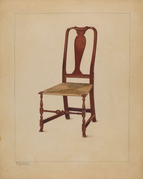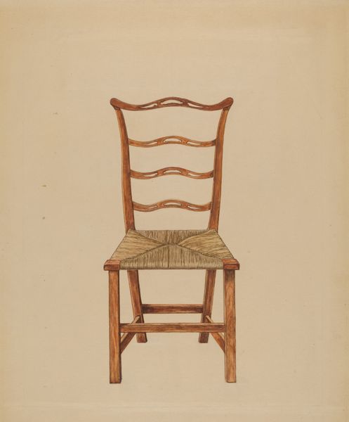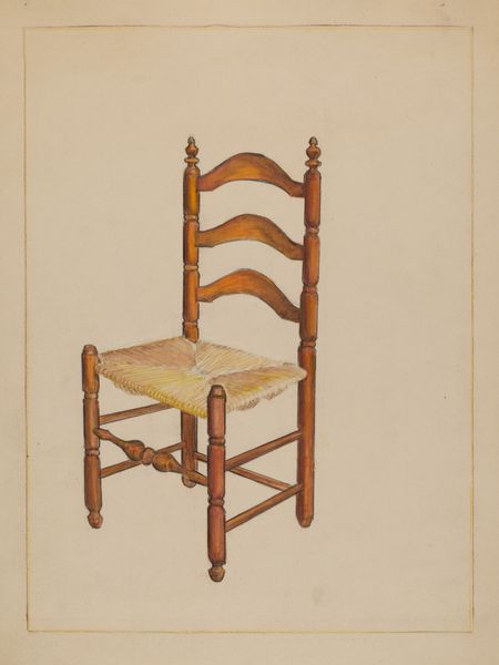 Editor: Here we have Nicholas Gorid’s "Side Chair," created around 1936, rendered in colored pencil. It's so detailed and precise, you can almost feel the texture of the woven seat back. What stands out to you when you look at this? Curator: What interests me is the act of depiction itself. The artist, Gorid, used colored pencil, a seemingly mundane material, to elevate a common, mass-produced object. Isn't it fascinating that this drawing captures a specific chair, which would have been manufactured within a network of resources and labor? How does that change our perception? Editor: So, you're focusing on the material and how it transforms the object. Curator: Precisely! The use of coloured pencil makes it less about the "high art" and more about labour and accessibility. This connects directly to the consumption culture of the time; could this image have been a design prototype? Editor: That's a thought! Could be a furniture catalogue? Curator: Possibly, highlighting the design, materiality and consumption of furniture production. Think of how much human labour was required to produce this chair, how does this influence the image’s worth in your opinion? Editor: I never thought of the material choice that way! It definitely prompts a different perspective to consider the entire production process. Curator: And to think, what stories a chair could tell!