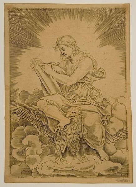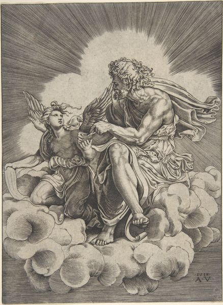 Curator: Agostino Veneziano's "Saint Matthew" presents us with a study in contrasts. The solid forms of the figures against the ethereal clouds create a dynamic tension. Editor: Yes, and immediately I notice how the symbolic weight of the angel and Matthew is palpable, their interaction heavy with the burden of divine inspiration. Curator: Note how the artist uses line to create depth and volume, particularly in the drapery and the musculature of Saint Matthew. The lines coalesce to form shape and shadow. Editor: The angel holding the quill really resonates. This echoes classical depictions of muses, and shows the enduring influence of those symbols. It also hints at the emotional turbulence inherent in receiving divine guidance. Curator: The texture created by the varied line weights gives a tactile quality to the intangible subject of inspiration. The artist masterfully uses line to convey spiritual presence. Editor: It is interesting to observe the enduring visual language of faith and revelation across centuries. Curator: Indeed, and Veneziano offers us an elegantly constructed exploration of that very language.