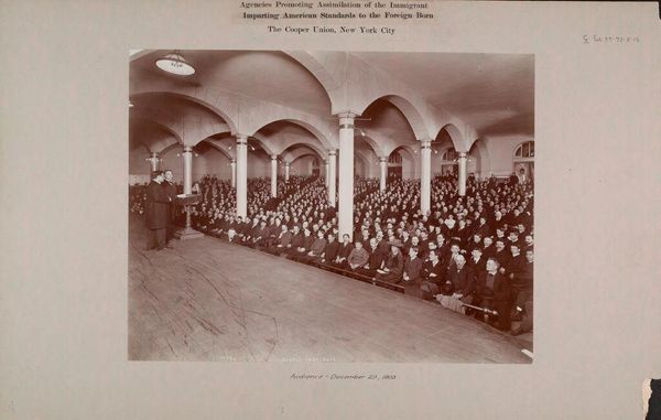 Curator: Here we have a photograph, likely taken around the turn of the century, of the General Faculty at the Tuskegee Institute in Alabama. The photographer is Frances Benjamin Johnston. Editor: Wow, such a powerful image. There's a real sense of solidarity in that group, something both stark and beautiful. Curator: Johnston was commissioned to document the Institute, showcasing its commitment to vocational training for African Americans, a key part of Booker T. Washington's philosophy. Editor: It's amazing how their formal attire, posed against that grand library backdrop, speaks to the dignity and aspiration that defined Tuskegee. It’s a quiet resistance in a way. Curator: Absolutely. Understanding the image demands that we recognize the Institute’s complex position within the racial politics of the time. Editor: Thinking about it, it’s not just a photograph; it’s a statement etched in monochrome, capturing a pivotal moment in American educational history. Curator: Indeed, and it offers us critical insight into the complex history of the Tuskegee Institute and race relations in America. Editor: A visual reminder that progress and perseverance come in many forms.
