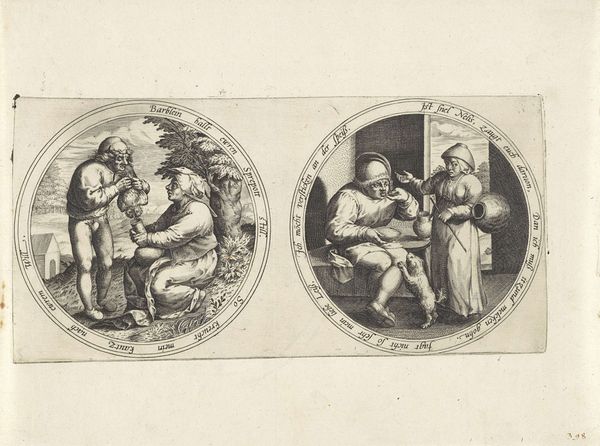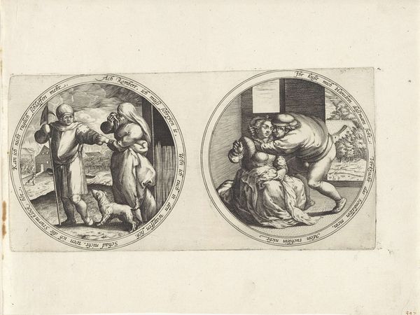 Curator: This intriguing engraving at the Rijksmuseum, titled "Echtpaar met een spiegel en een visser die een vrouw een vis overhandigt"—loosely translated as "Couple with a Mirror and a Fisherman Offering a Woman a Fish"—invites layered readings of its historical moment. Attributed to an anonymous artist and dated somewhere between 1555 and 1631, it presents two circular scenes. What strikes you first about its composition? Editor: Immediately, I notice the starkness of the engraved line, the precision of the tool biting into the plate. The artist's labour, painstakingly creating these two worlds, the almost allegorical feeling of these contrasting scenes. It looks extremely material, I wonder if it had to do with wedding practices, perhaps the beginning of bourgeois practices of gift exchanges. Curator: That's a compelling point regarding the material gift as an emblem. It echoes with narratives around courtship rituals and gendered economic exchanges. The image on the right presents this quite literally with the exchange of fish from a male figure to the young lady, who is possibly being tempted into this deal with fish that could symbolise the wealth being offered and her power. While on the left there's an aged couple in bed with what seems like a child? Are they reflections on ageing? Or family ties? The material and meaning have a direct social commentary. Editor: The social element is undeniable, particularly within the medium itself. This work wouldn’t exist without the specific tools and processes required. You're totally right, it raises the idea of generational exchanges, the continuity of labour, from the fisher to family ties, through the means of providing with gifts! Curator: The medium’s dissemination, through printmaking, means these themes reach broader audiences, shaping discourses about social and economic relationships—specifically about social hierarchy and social capital through gender in European families during the era it came from. What the message delivered could be very impactful to cultural norms and customs that might not be available to common viewers like us. Editor: Exactly. The act of repetitive printmaking underscores the act of standardized labor that enables visual propaganda of wealth to occur, as in fishing or relationships, where gifts in the image are then proliferated and consumed en masse in European popular media. The meaning could potentially be skewed by social interpretation with class in mind, which would ultimately turn into further political arguments of family planning. Curator: Thinking through these various intersections allows us to appreciate its role, a humble-seeming print, which had considerable resonance in broader social narratives. Editor: And looking at the materiality opens our understanding of the period, helping reveal labor practices and political tensions within European history and beyond, from gender all the way to ageism.