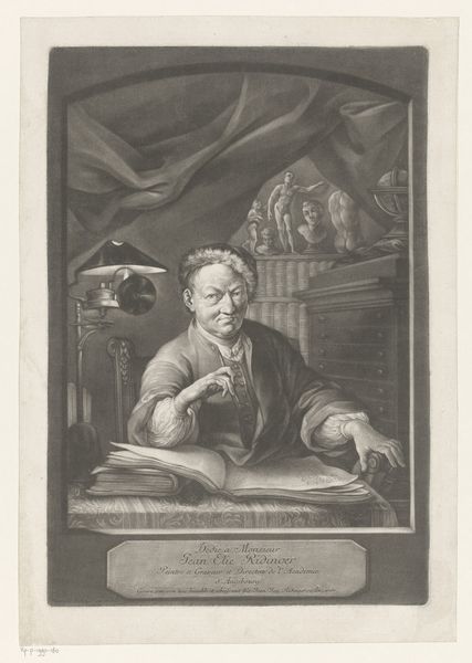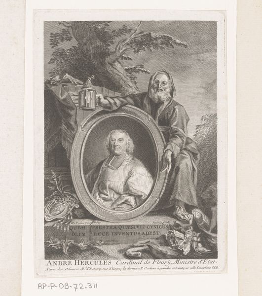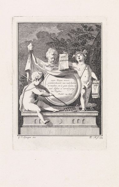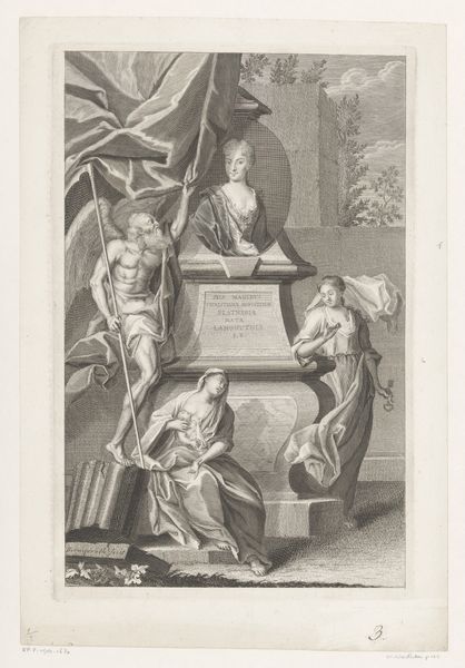 Christian Gottlieb Geyser created this print, "Portret van Heinrich Sander in allegorische setting," using etching. This allegorical portrait is laden with the visual language of its time, reflecting the enlightenment's ideals about virtue, memory, and the public persona. The portrait of Heinrich Sander is framed by symbolic elements characteristic of eighteenth-century memorial art. Two classical figures adorn Sander’s memorial. One kneels in grief, while the other gently drops flowers into her hand. The Latin inscription implies that grief and sighs are not enough, urging a more profound remembrance. The composition invites us to consider how Sander was meant to be remembered. The neoclassical imagery, common among the educated elite, speaks to a desire for lasting recognition. However, the emotional display of grief hints at a more personal, perhaps vulnerable, dimension of public life.