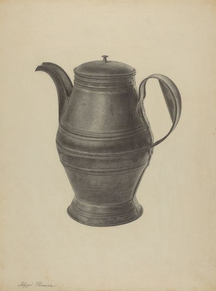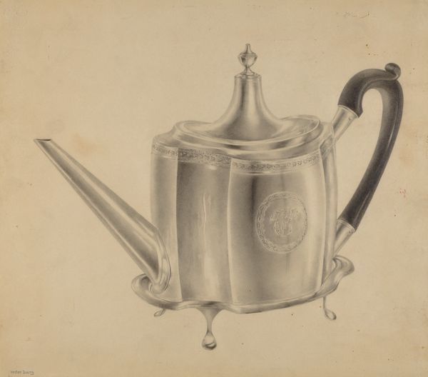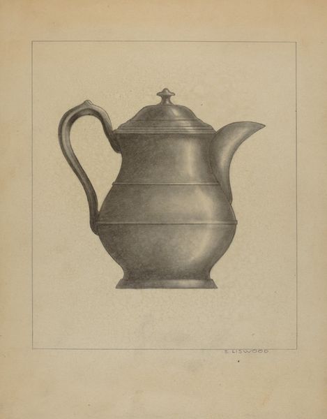 Editor: So, here we have Arthur Merkley's "Pewter Teapot," circa 1937. It appears to be watercolor on paper, and the depiction is surprisingly realistic. What strikes me is how the artist renders light on the metallic surface. What are your thoughts? Curator: Indeed, the artist’s commitment to capturing the subtleties of light and shadow on a commonplace object is quite compelling. Notice the geometrical volumes composing its form and how their stark contrasts and subtle gradations give rise to a dynamic surface. Have you observed how the planes intersect, defining the spatial arrangement of this otherwise humble object? Editor: I see what you mean. The handle's curve and spout's angle create such interesting contrasts. What does that mean for us, the viewer? Curator: I contend it shifts our attention to the internal structure, a rigorous semiotic framework of form. The artwork then presents us with a new way to see. It underscores that realism, rather than just imitation, is about close inspection and refined visual arrangement, which in turn informs us about the qualities of observation. Are we to distill form and volume through attentive practice? Editor: That's a great way to consider it! The analysis truly moves beyond the surface of realism, emphasizing a calculated dissection. Curator: Exactly! I daresay it helps us reassess our understanding of quotidian representation, pushing into realms of structure and visuality. Editor: I really appreciate your formalism here! Thank you for the new lens. Curator: The pleasure was all mine! Let us keep examining artwork, attending closely to their intrinsic qualities to elevate and nuance our perception.
