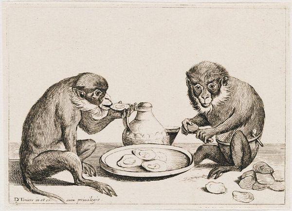 Curator: This is "Monkey Treating the Wounded Hand of Another Monkey with Sticking Plaster" by Coryn Boel, a 17th-century artist. Editor: I'm immediately struck by how human the scene feels, the tender care being depicted. Curator: It’s fascinating, isn’t it? Boel was part of a tradition where monkeys acted as stand-ins for human behaviors, offering commentary on society. Editor: So, it’s not just a quirky scene; it’s a mirror reflecting our own societal structures and absurdities. Who has the power, who needs care? Curator: Exactly. The image engages with themes of hierarchy, medicine, and care, all within a carefully constructed animal world. Editor: It makes you consider how we assign roles and expectations, even within our own communities. Curator: This image continues to ask us who gets to be the healer and who needs healing. Editor: A potent reminder that art from the past can still spark critical reflection today.