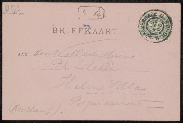 Curator: This humble-looking piece, titled "Briefkaart aan Philip Zilcken," potentially dates back to 1904 and originates from the hand of Willem Maris. It's an ink drawing on paper, really a personal correspondence, an artifact. Editor: It feels so delicate, almost ephemeral. I immediately think about how lightweight a single piece of paper must have felt in comparison to the importance we place on quick, but massive, information transmission these days. Curator: Absolutely. It's easy to forget the physicality of communication back then. Notice how the ink bleeds slightly into the paper, how the lines waver with the pressure of the pen. These aren't just words; they are imprints of the artist’s hand, of his intention and perhaps, impatience. Editor: And I am also taken by that idea of craftsmanship inherent in the materials. Pen, ink, paper: each specifically produced. Consider the labor that went into milling the paper to create the surface, and crafting the nib of a pen. This elevates an everyday postal item. Curator: And observe how even the lettering itself is an art form. The elegant curves, the varying thickness of the strokes, all imbued with personality. Think of the care given to crafting that typeface in ink to render the message personal and visually appealing. Editor: The details are revealing: that little stamp in the corner, the postal markings smudged just enough to feel touched by time and handled as material and method. It is such a great demonstration about how even small and ephemeral processes tell larger material narratives. Curator: Indeed. Looking at it this way, the “Briefkaart” transcends its original purpose, revealing instead how the simple act of sending a message was—once upon a time—infused with artistic sensibility, materiality, and care. A window into a world far removed from our own. Editor: Ultimately, this piece underscores that art resides not only in grand pronouncements but also in quiet interactions with matter and production. It’s fascinating how art can show our reliance on resources.