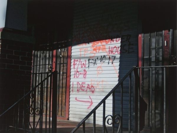 Editor: So, here we have a photograph by Richard Misrach, likely taken between 2005 and 2010, titled "Untitled [New Orleans and the Gulf Coast, 2005]." The image really hits you with its raw urgency. I’m struck by the red spray paint against the weathered building— it feels like a desperate cry for help. What's your read on this, coming from your perspective? Curator: What strikes me is precisely that raw nerve exposed, the way the built environment becomes a canvas for survival. This isn’t just a photograph; it’s a document etched with human experience—fear, resilience, and a visceral connection to place. Can't you almost smell the mildewed sheetrock? Editor: Absolutely! And the messages...they're so direct, like, "Dogs we have animals NOT leaving". Curator: Precisely. Misrach isn't merely capturing a landscape. He's capturing the residue of trauma and love. Notice how the red, so aggressive and defiant, ironically signifies a fundamental tenderness— the desperate need to protect. In a place where the storm stripped away everything, including human dignity, what can one leave but the written word, marking space and existence? Editor: So the spray paint almost acts as a claim...a staking of territory. I guess, reclaiming power after feeling helpless. Curator: Exactly. It reminds me a little of Basquiat or Haring's subway art— using what’s available to scream existence into the void. Editor: That connection between those two forms of urban messaging totally reframes it for me. It's a fascinating visual language born from necessity. Thanks! Curator: Indeed. It is that raw, unfiltered emotion and urgency that elevates Misrach's work from mere documentation to poignant storytelling. Remember that feeling - it's one worth carrying through life, and art!