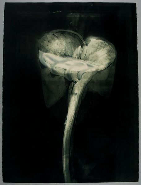 Curator: It's striking, isn't it? Michael Mazur's "Gesture of the Calla, 3." The stark contrast makes it seem almost like a photographic negative. Editor: Yes, its graphic nature, and monochrome palette evoke a kind of ghostly presence. It speaks to fragility, maybe even loss. What do you make of the process itself? Curator: Mazur was deeply involved in printmaking, pushing the boundaries of what the medium could do. His focus was the labor and process of bringing something like this flower to life on the page. I see the hand in every stage of the print, from the preparation of the plate to the final impression. Editor: I see that, too, but I am also intrigued by the symbolic resonance of the calla lily itself. It has become such a loaded image, often associated with mourning, but also with beauty, resilience, and ideas of femininity. Mazur’s framing invites a discourse on these themes. Curator: The scale of the image also draws you in. It is delicate but imposing—inviting you to consider not only the final image but also the physical labor involved in its making. Editor: It's a quiet piece, yet it resonates with so many potential narratives. Curator: I’ll be pondering Mazur’s choices for some time.