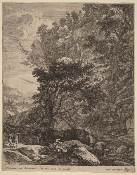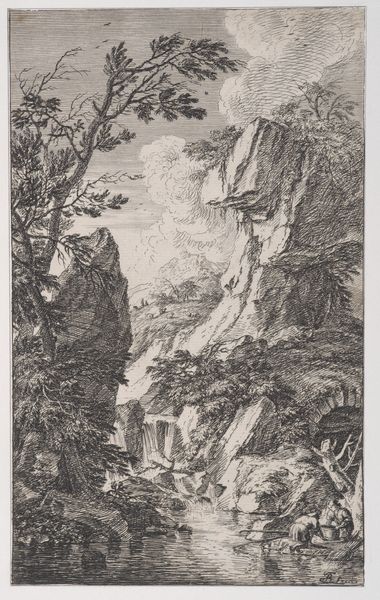 Franz Joachim Beich made this print, “Plate 2,” using etching, a printmaking technique that democratized image production. The process begins with a metal plate covered in a waxy ground. The artist then draws through the ground, exposing the metal. When the plate is dipped in acid, the exposed lines are etched, creating grooves. The ink fills the recessed lines, and the plate is pressed onto paper. The final print carries the image. The etching process creates fine lines and intricate details, evident in the rendering of the rocky landscape and figures. The hunter with his gun, the chamois, and the sweeping trees each demonstrate the artist’s control of the medium. The rough, almost scratchy quality of the lines contributes to the overall atmospheric effect. Etching allowed artists to create multiple copies of their work, making art more accessible to a wider audience. In Beich’s case, it allowed him to disseminate his landscapes ‘in the manner of Salvator Rosa’, referencing a well-known artist and claiming his own place in that lineage. This print underscores how material and process shape both the creation and consumption of art.