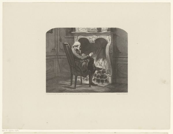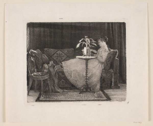 Curator: This is "Woman Praying by a Corpse" by Hendrik Adriaan Christiaan Dekker, dating from 1846 to 1863. It combines the graphic techniques of etching and pencil in its rendering. Editor: It's stark, isn’t it? The kind of room that holds its breath. You can almost smell the beeswax from those candles next to that severe, gothic cross. Curator: Precisely. Note how Dekker uses contrasting light and shadow to structure the composition, guiding the viewer's eye from the mundane details of the fruit on the table, to the illuminated figure of the praying woman. Editor: The lines on her hunched back! They are screaming, her body is practically a question mark pointed at the shrouded bed. I can practically hear her whispering prayers and desperate pleas. Curator: Indeed. Dekker evokes strong emotional resonance, drawing upon romanticist sentiments and, notably, grounding it with realist techniques. Consider how the formal geometry of the cross balances against the organic, curvilinear shapes in the folds of her habit and the linens. Editor: Balance implies an equal distribution; but here, every geometric certainty seems to crumble. The very act of mourning feels so intimate, it feels like the scene shouldn't be watched. It's almost like invading her space. Curator: Perhaps Dekker means to critique, as much as portray. Consider how he positions the viewer – not as a participant but an observer. We are granted access to a private moment of grief. The composition acts almost as a moral reflection. Editor: A reflection indeed. In a very sobering manner. This image certainly carries an immense, and sorrowful gravitas. It makes me thankful for the loved ones around me now. Curator: And in its formal precision and carefully constructed visual language, Dekker manages to evoke profound emotional empathy with this poignant narrative.